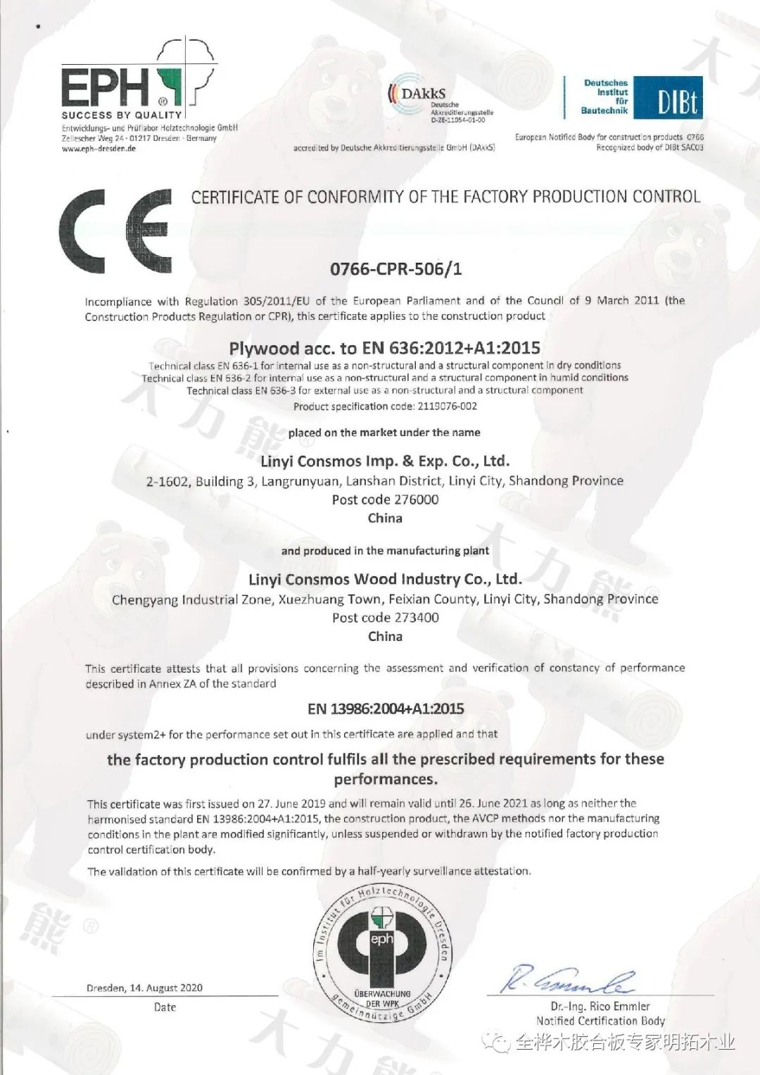 為滿足歐洲市場需求,經過全體人員的不斷努力、創新,我公司膠合板產品又一次通過歐盟CE檢測,獲得歐盟認證的CE證書,取得了進入歐洲市場的通行證,這是我公司第四年獲得CE這一國際標準證書,標志著明拓大力熊的產品在國際市場上得到了進一步的認可。